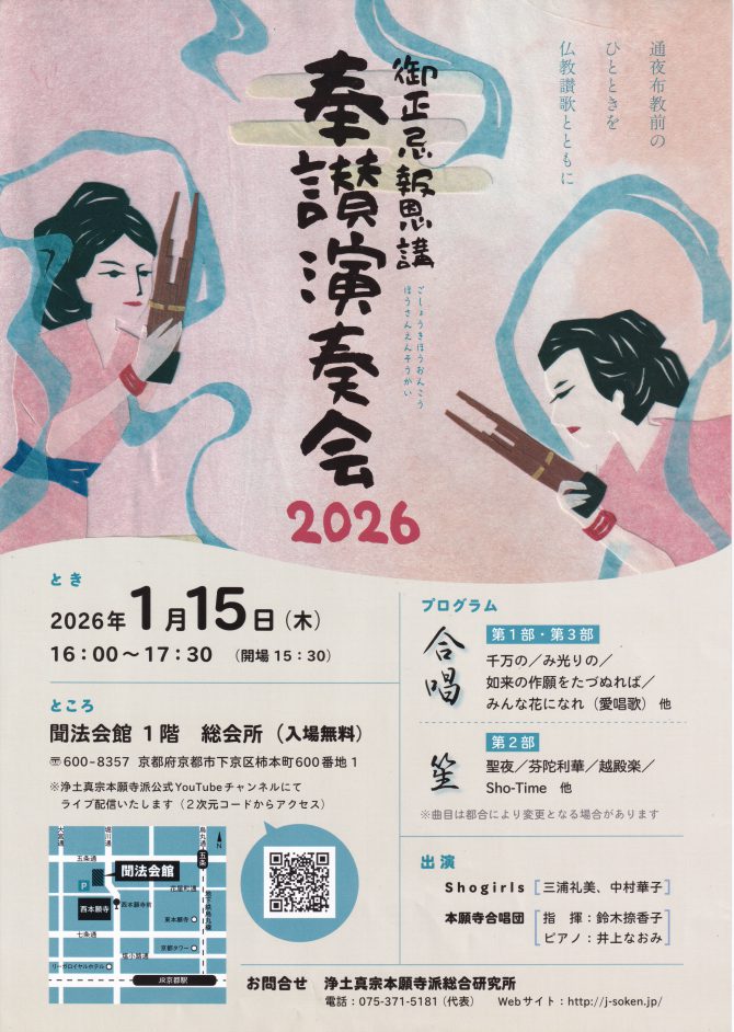 平田聖子作曲・親鸞聖人ご和讃「如来の作願をたづぬれば」が、指揮/鈴木捺香子、ピアノ/井上なおみ、合唱/本願寺合唱団で演奏されます。昨年も京都コンサートホールにてこのメンバーで演奏してくださり、たいへん素晴らしかったので、是非お聴きください。Tou Tubeのライブ配信があります。「相好ごとに百千の」も演奏される予定です。1月15日(木)16:00~