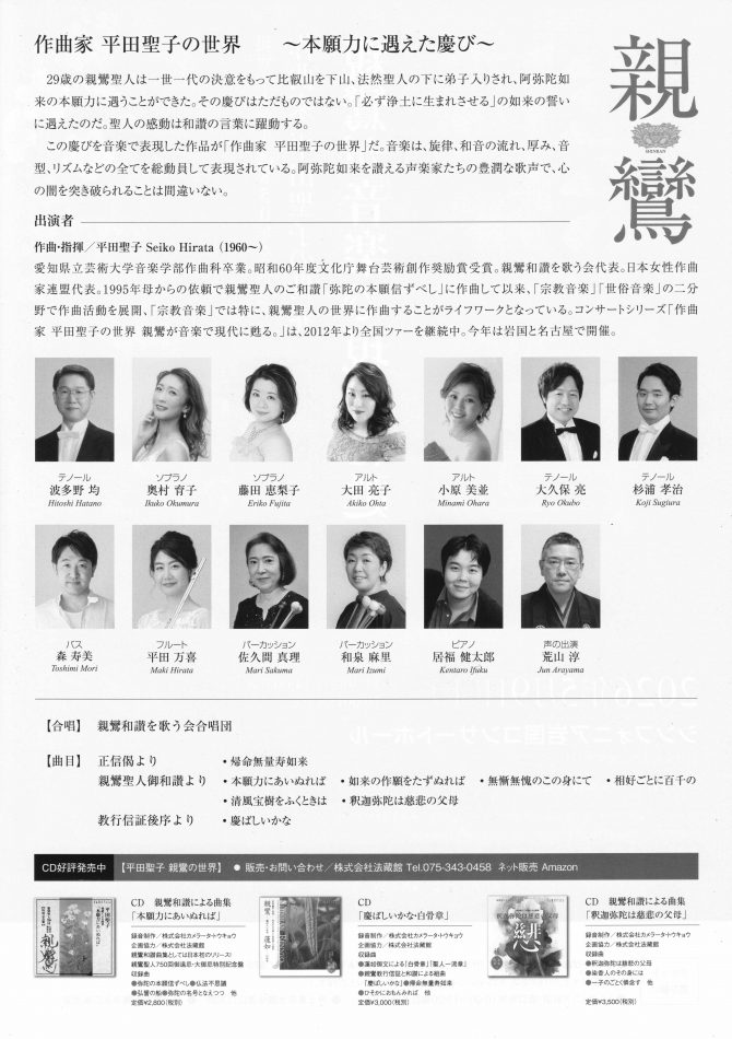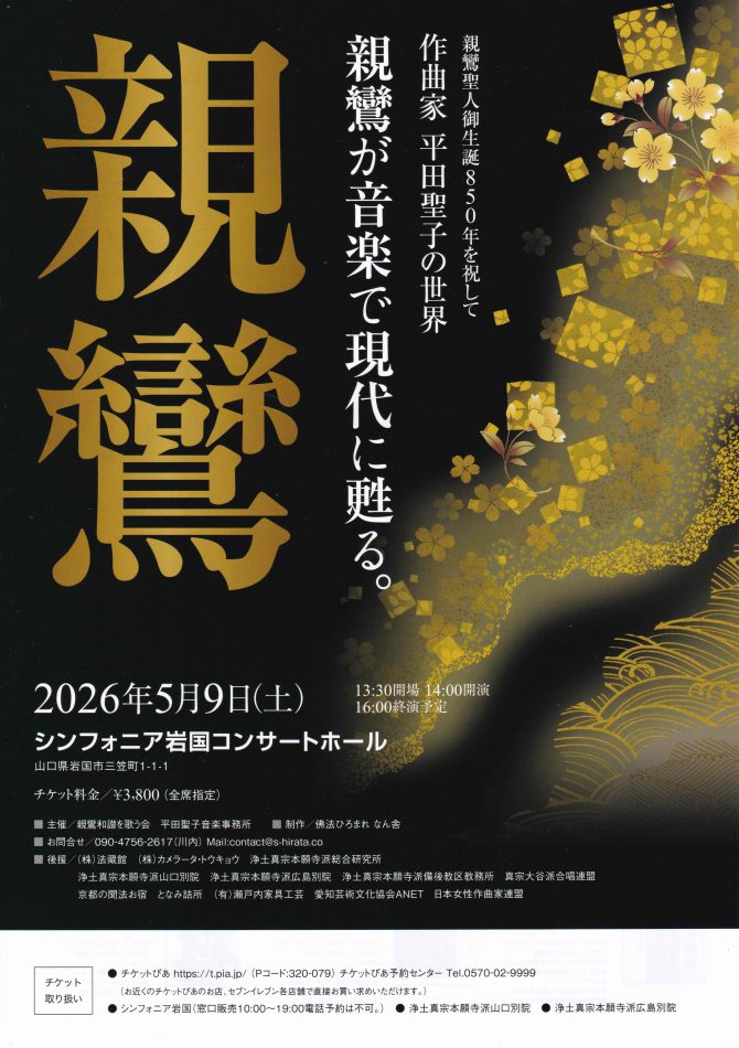 2026.03.07山口県シンフォニア岩国にて 5月9日(土)、「作曲家平田聖子の世界 親鸞が音楽で現代に甦る。」コンサートを開催。親鸞聖人の「本願力に遇えた慶び」を、旋律、和音の流れ、厚み、音型、リズムなどの全てを総動員して表現しています。阿弥陀如来を讃え、どの曲にも「南無阿弥陀仏」が多様な旋律にのって歌われます、全20作品。ご来場お待ちしております(^^♪