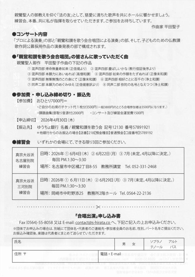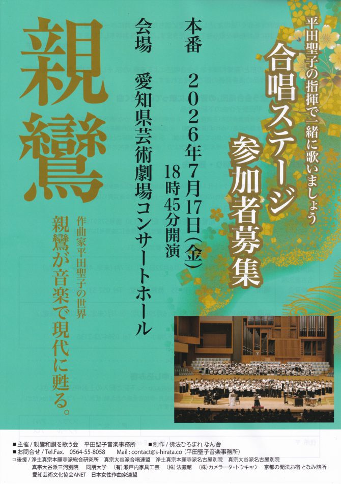 2026.01.12名古屋で親鸞コンサートを開催します。7月17日(金)18時45分開演です。親鸞聖人のみ教えを仰ぐ「法の友」として、慈愛に満ちた歌声を共にホールに響かせましょう。練習会、本番、共に私が指揮を執らせていただきます。ご参加をお待ちしています。合唱参加を募集しています。